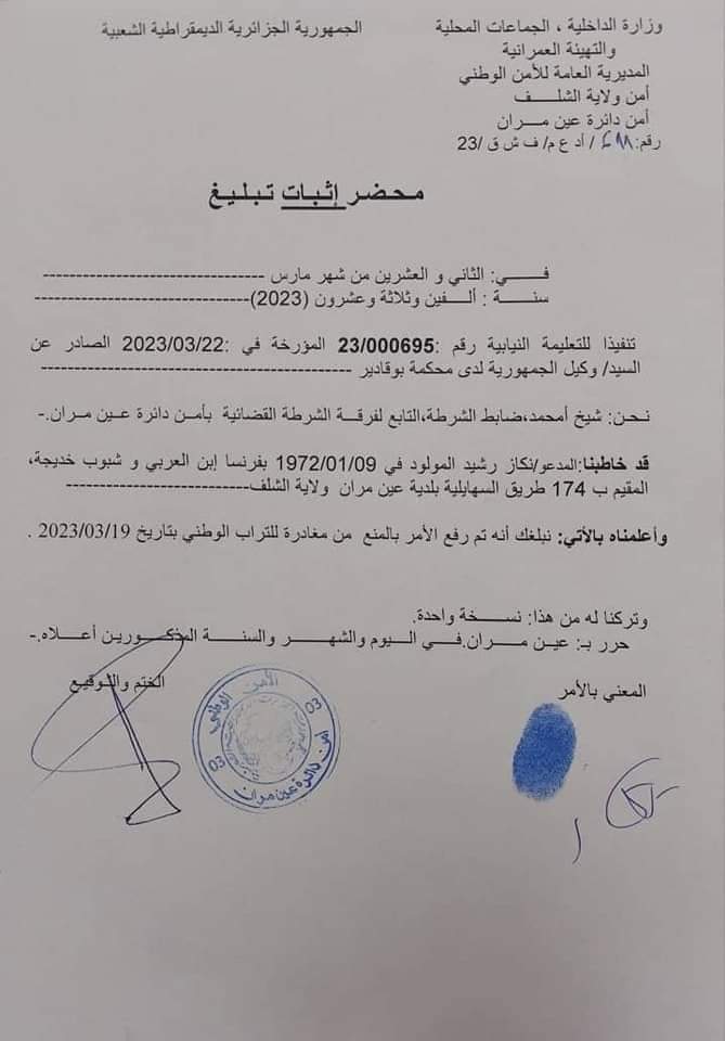 وحسب ما جاء في بيان المديرية، أنه تم تبليغ رشيد نكاز، برفع الأمر عنه من مغادرة البلاد، وذلك تنفيذا للتعليمة النيابية الصادرة عن وكيل الجمهورية لدى محكمة بوقادير، في ولاية الشلف.