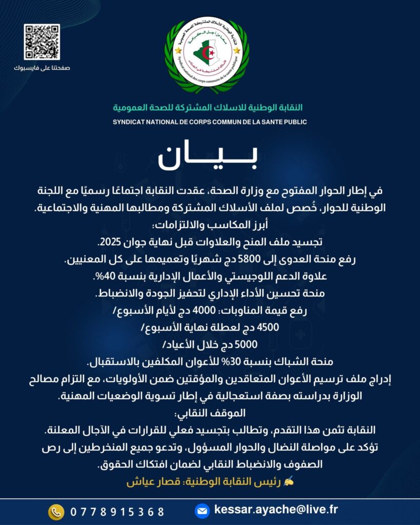 في خبر سارّ لفائدة آلاف العمال في قطاع الصحة، أصدرت النقابة الوطنية للأسلاك المشتركة للصحة العمومية بيانًا رسميًا، أعلنت فيه عن زيادات معتبرة في عدد من المنح والعلاوات، وذلك عقب اجتماع هام مع اللجنة الوطنية للحوار التابعة لوزارة الصحة.