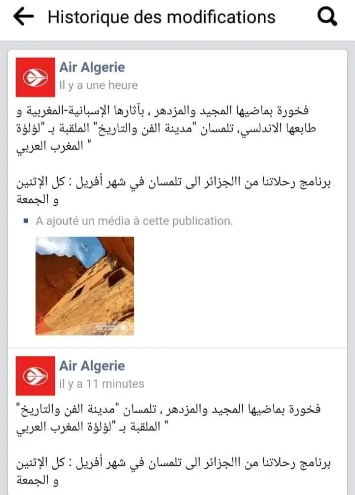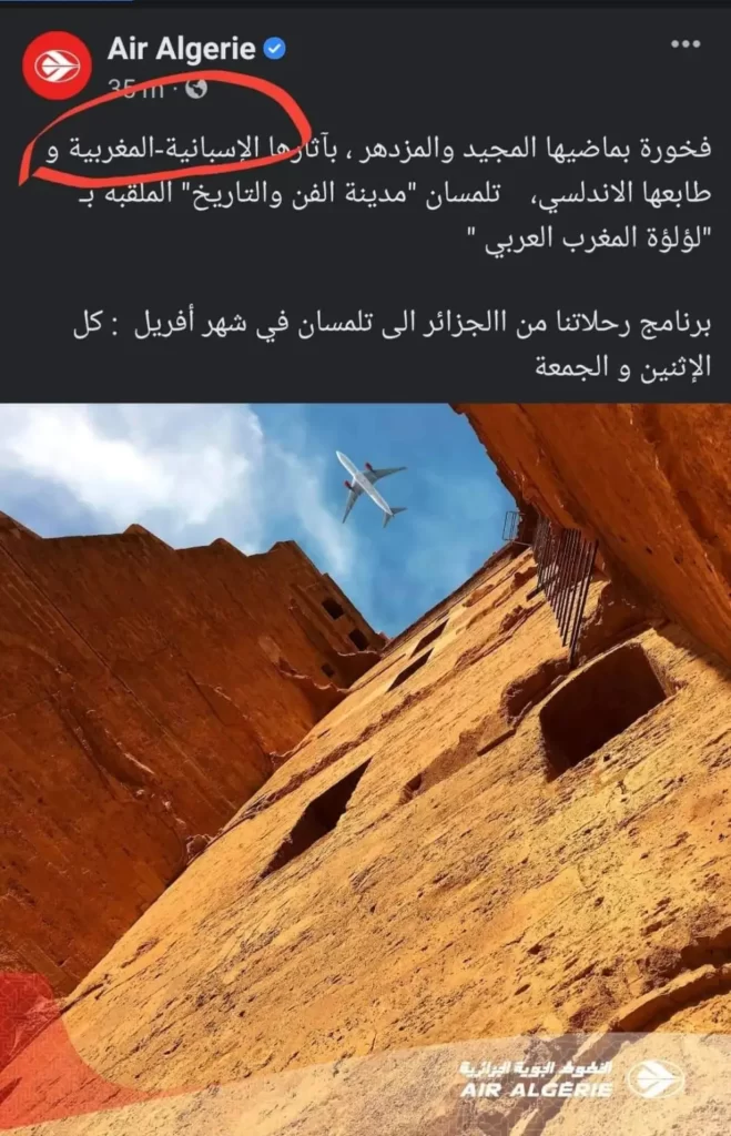 وكتبت الصفحة الرسمية الجوية الجزائرية على موقع فيسبوك منشورا نسبت فيه الآثار والفن الذي تزخر به ولاية تلمسان إلى إسبانيا والمغرب.