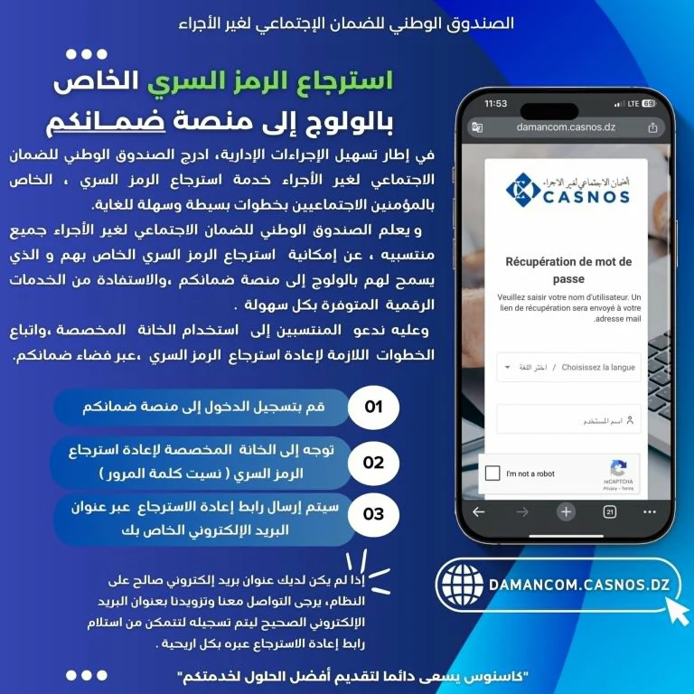 أخبار بلا حدود- أعلن الصندوق الوطني للضمان الاجتماعي لغير الأجراء (CASNOS)، الأربعاء، عن توفير خدمة جديدة تتيح للمؤمنين الاجتماعيين استرجاع الرمز السري بسهولة عبر منصة “ضمانكم”.