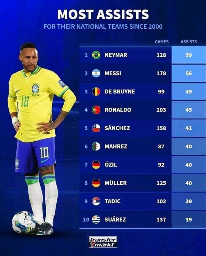 واحتل البرازيلي نيمار صدارة القائمة برصيد 59 تمريرة حاسمة قدمها خلال 128 مباراة، وجاء الأرجنتيني ليونيل ميسي ثانيا بـ 56 تمريرة في 178 مباراة.