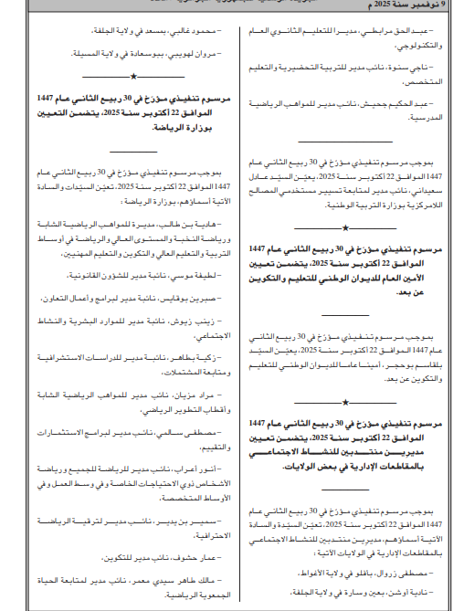 كما تضمن العدد ذاته من الجريدة الرسمية مراسيم تنفيذية متزامنة، شملت تعيينات جديدة وإنهاء مهام بعض الإطارات والمسؤولين في مناصب عليا عبر قطاعات مختلفة، وذلك من أجل ضمان الاستمرارية في تسيير مؤسسات الدولة وتحسين فعالية الأداء الإداري.