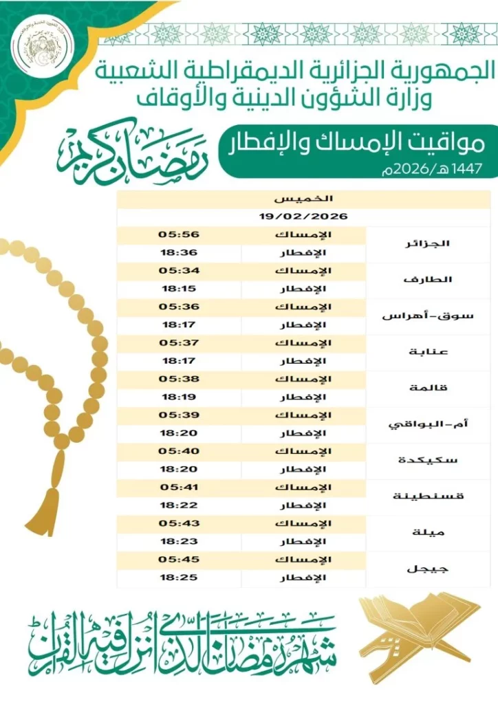 يحرص الجزائريون مع حلول كل شهر رمضان على متابعة مواقيت الإمساك والإفطار بدقة، سواء عبر البيانات الرسمية لوزارة الشؤون الدينية أو من خلال الإمساكيات المحلية الخاصة بكل ولاية.